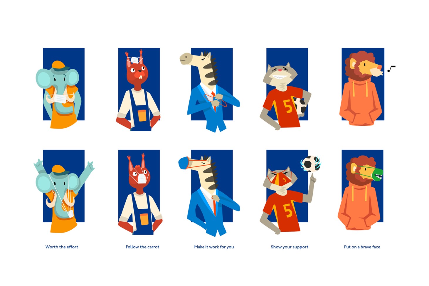 We created a set of ten animal characters who could all be used in a friendly way to convey the various messages.