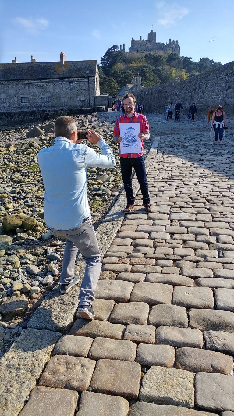 After absorbing the view for a while we slowly took ourselves back across the causeway (no need for paddling this time) and stopped for a few photos of Leo and the prints he has created depicting the Mount.