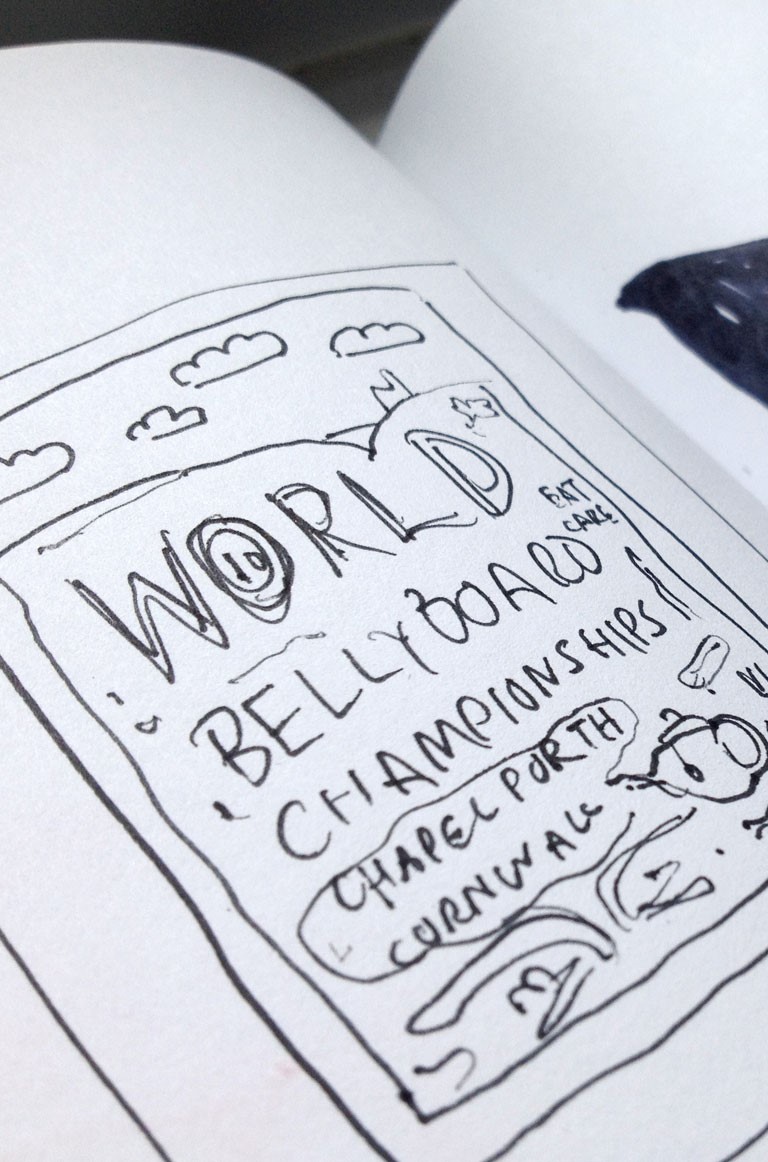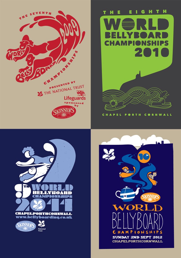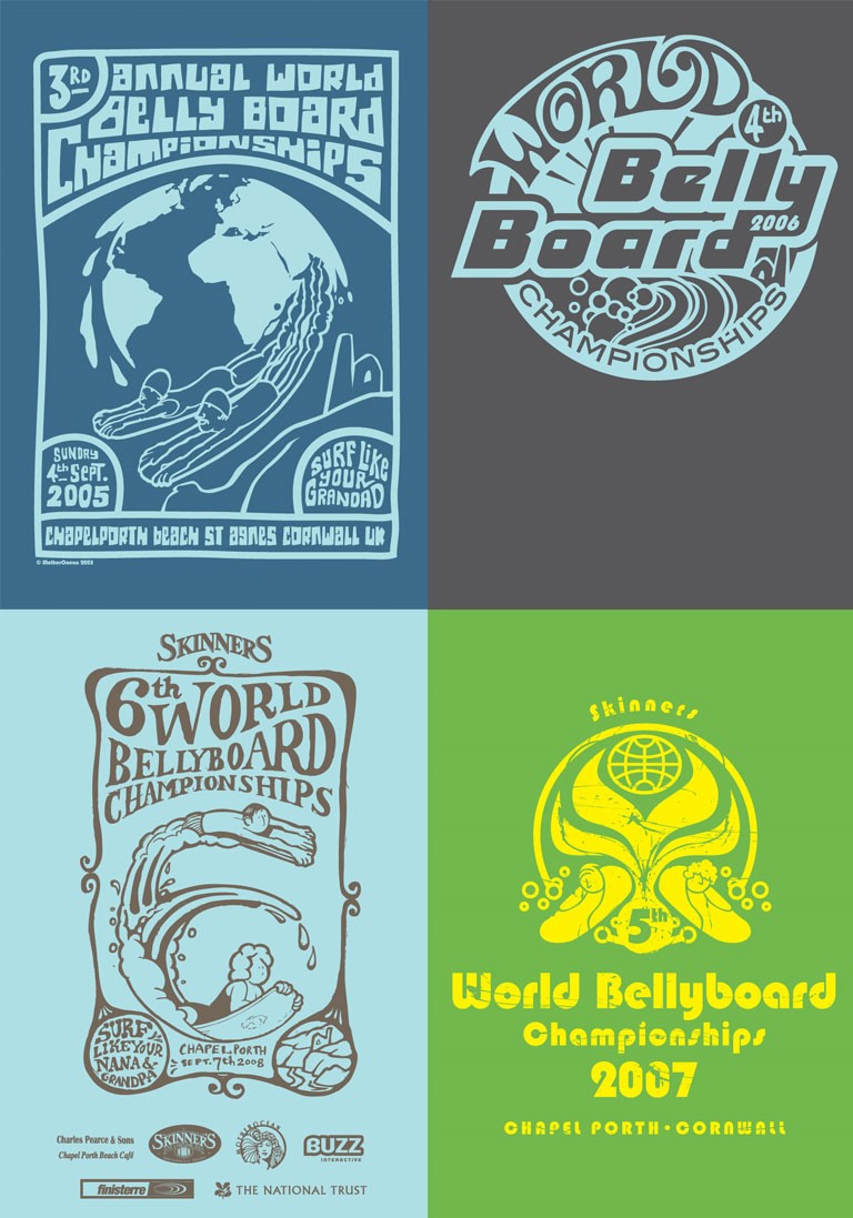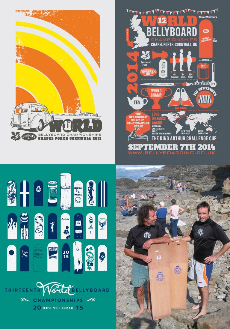 As well as looking after the ever-popular t-shirt stall I took on the task of designing the poster and t-shirt. This never felt like a chore, more like an honour. Invariably August would descend upon me and the honour was hastily finalised and sent off to be screen-printed prior to the September championships. For many years the t-shirts included a couple of bellyboarders – this wasn't intentional, it just happened. They became known as Frank and Barbara and, after many years surfing on the tees, 2013 saw Frank and Barbs watching proceedings from their trusty Traveller. The following year, 2014, was the first year they didn't feature on the print. A poignant retirement of the two bellyboarders, following a tough year in 2013. My father had died of a genetic illness in the July and as September approached I faced the prospect of both attending the event and manning the stall without him. It was something we'd always done together – the previous year, 2012, was the first time he had not participated in the water. There was only one thing to do: get my head down and design a t-shirt and get behind the stall - an approach that was made all the more possible with the superb support from the team behind the championships. In recognition of my Dad's contribution to the event his name was put to the 'Spirit of Bellyboarding' award, given out each year to an individual or couple who have really embraced the unique spirit of this eccentric event.